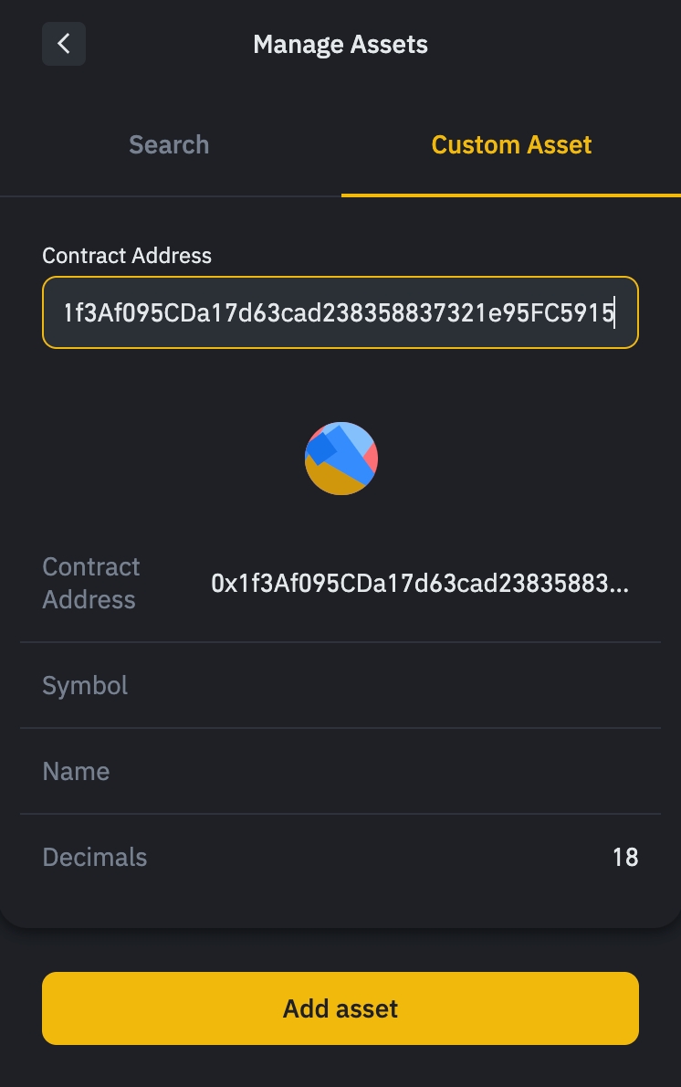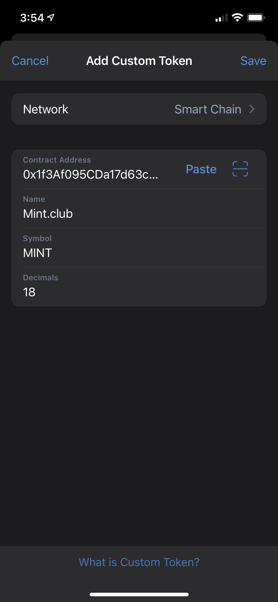 4. If you can't search the token, scroll down and click the Add Custom Token button on the bottom, and type the following information and make sure that you set Smart Chain Network