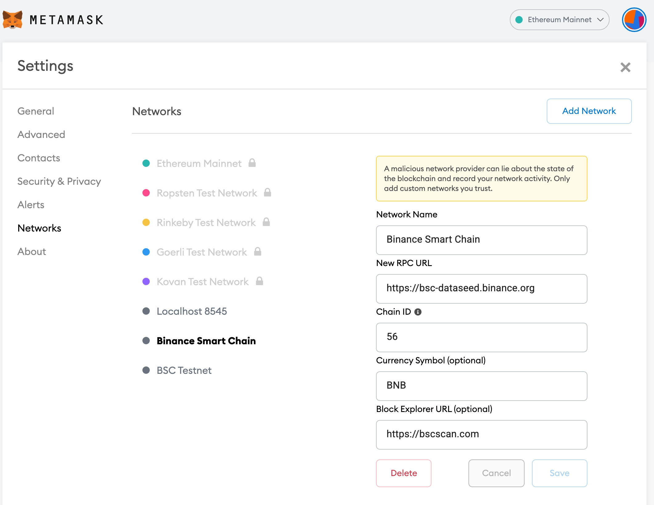 (If you need more detailed information about the Network configuration, please read this article - https://medium.com/blind-boxes/how-to-guide-connecting-metamask-to-binance-smart-chain-7403c1f33170).