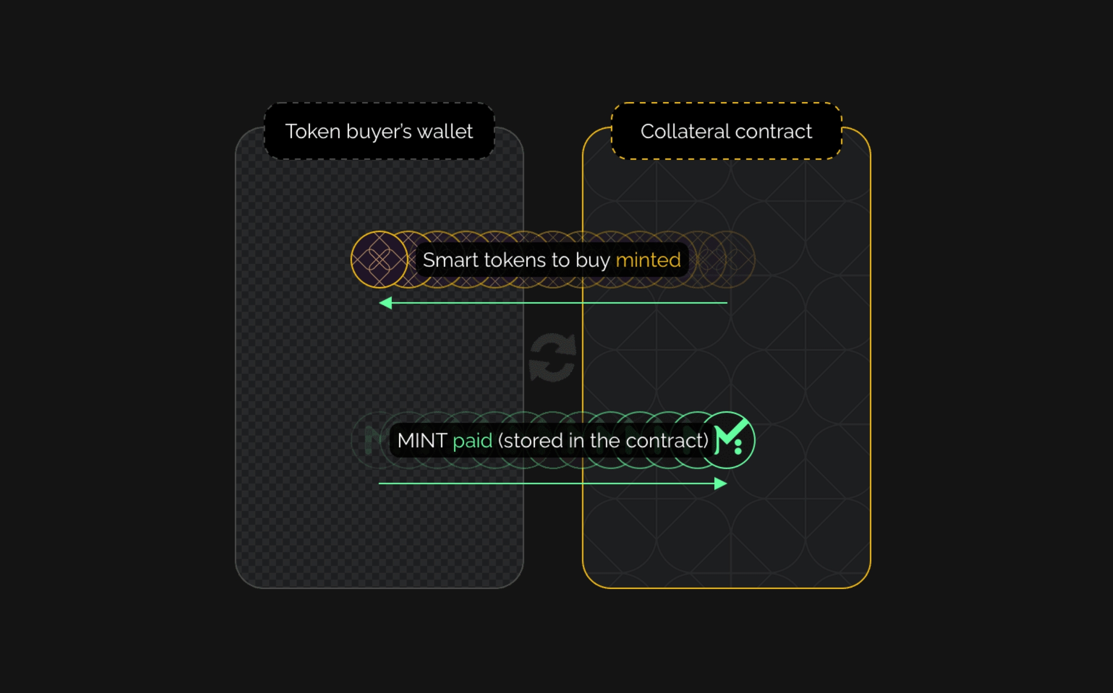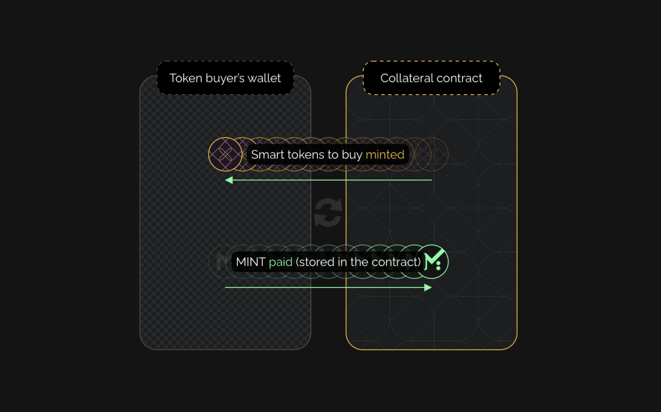 When a smart token is purchased, the price bonding curve calculates the amount of MINT to be paid and swapped between them. The paid MINT tokens are stored on the collateral contract of the smart token, and the amount of smart tokens are minted to the buyer in return.