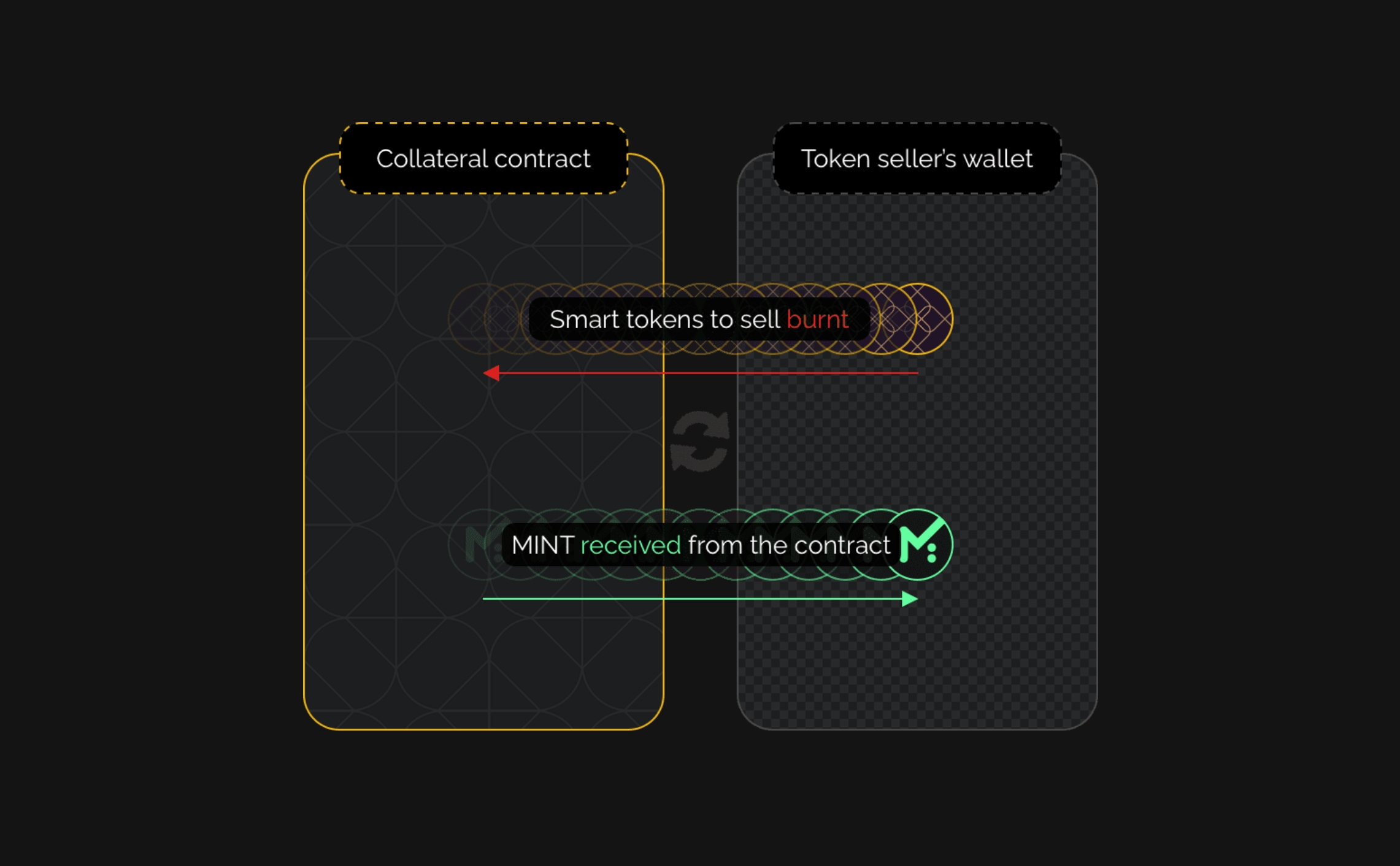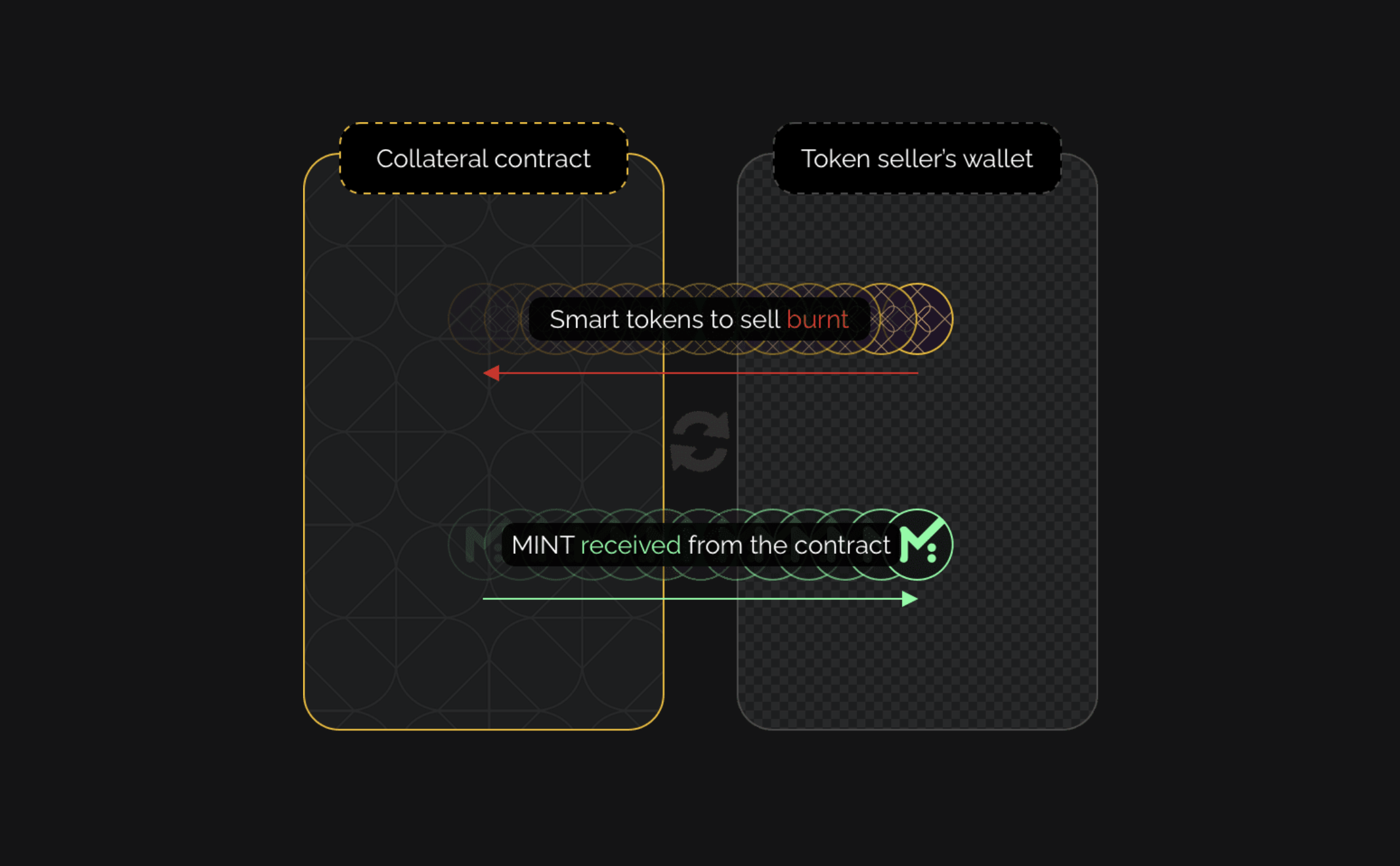 When a smart token is sold, the price bonding curve calculates the amount of MINT to be given, and swapped between them by returning the MINT tokens to the seller and burning the sold smart tokens.
